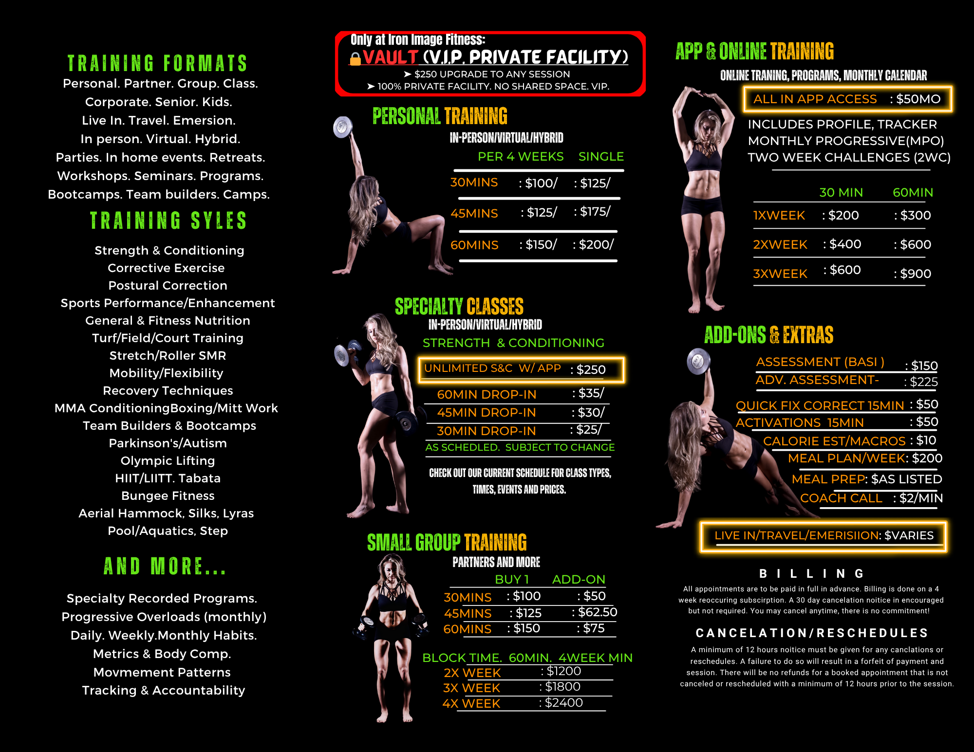 We’d love to co-create any services that would be valuable to your health and happiness. Please note we also have daily, weekly, monthly and annual events. Our assessments are done bi-annually at minimum or as needed for all clients & class members. Thank you for choosing Iron Image Fitness! Welcome to the IIF-fam.